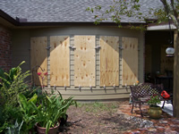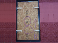(aluminum framed) / double doors / top and side windows with plywood installed and secured by Storm Clamps. |