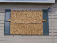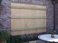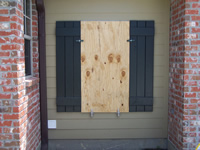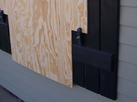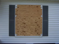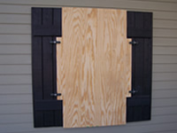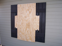 Plywood supported by decorative shutter, secured by storm clamps. |