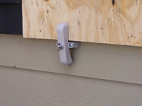 (aluminum framed) / single window / close up of upper Storm Clamps securing plywood.