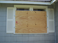 (aluminum framed) / single window / plywood installed and secured by Storm Clamps.