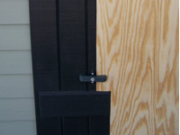 Window with decorative wooden shutters and Storm Clamps installed on shutters. |