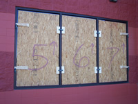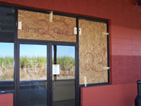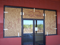 Commercial store front (aluminum framed) / triple window / plywood installed and secured by Storm Clamps.
