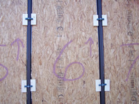 Storm Clamps securing cross boards, holding plywood in place. |
