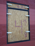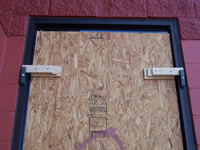 Commercial store front (aluminum framed) / single window / plywood installed and secured by Storm Clamps.