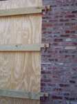 Brick frame window with plywood installed and secured with Storm Clamps. |