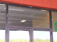 Commercial store front (aluminum framed) / double doors with surrounding windows and Storm Clamps installed.