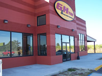 Commercial store front (aluminum framed windows and doors — Storm Clamps installed on all in the stowed position.)