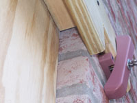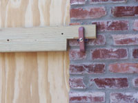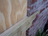 Brick frame window with Storm Clamps installed positioned for plywood placement. |